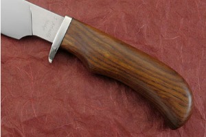 The trailing point blade was forged to shape from 5160 carbon steel. Hardened to Hrc 58-59, the knife will have a keen, long lasting edge. An appleseed grind ensures strength and durability. A hand rubbed satin finish adds an heirloom quality. The handle is formed from a solid piece of che-chen, a Caribbean rosewood. The knife is accompanied by a handsome 9 oz leather sheath made by Jim.