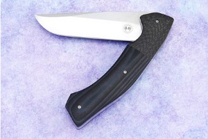 The 12C27 stainless steel blade has been hand satin finished on the grinds and mirror polished on the flats. This accentuates the unique, crisp grind lines. The blade is easily opened using the flipper mechanism or with a simple flick of the wrist. Carbon fiber bolsters are dovetailed to the micarta scales for a perfect fit. Titanium liners keep the knife light and fast. The blade is well centered and has silky smooth action. It is easy to keep this handmade folder close at hand with the steel pocket clip. Excellent fit and finish throughout!