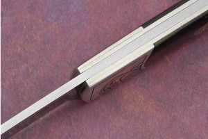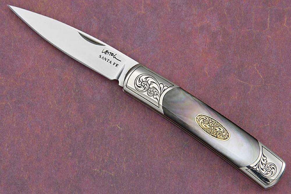 The mirror polished ATS-34 stainless steel blade is precision ground for a thin, high performance edge. It is easily opened using the thumb nick. Excellent action and well centered. Front and rear bolsters are perfectly fit to exhibition grade blacklip mother of pearl scales. The bolsters have been engraved. A 14k gold escutcheon is engraved to fine detail. The engraving was done by hand, one knife at a time by Rex Pedersen, a longtime member of the Engravers Guild of America.