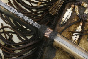 Sheath: Latigo leather, wrapped and hand stitched in rawhide by Karen Shook