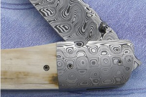 Description: South African knifemaker George Muller creates an exceptional knife at a remarkably low price. The bolsters and hollow ground blade are formed from stainless Damasteel. The patterns are immediately captivating and is nicely complimented by the precision grind lines. Fileworked spine. Fossil mammoth ivory scales are dovetailed to the Damascus bolsters for a perfect fit. The mammoth ivory is cream toned with caramel highlights. Anodized titanium liners keep the knife light and very strong. Damasteel backbar. An exceptional find!