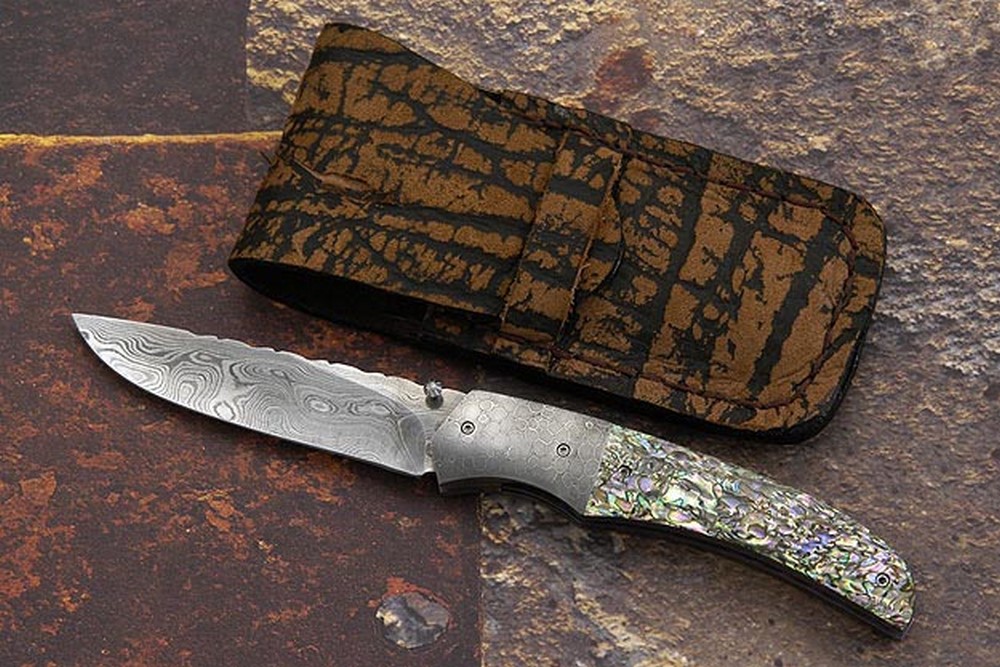 Description: South African knifemaker George Muller creates an exceptional knife at a remarkably low price. The hollow ground blade and bolsters are formed from damascus forged from carbon steels, assuring a keen, long lasting edge. The patterns are immediately captivating and is nicely complimented by the precision grind lines. The spine has been fileworked in a vine pattern. Abalone scales are dovetailed to the Damascus bolsters for a perfect fit. Blue anodized and fileworked titanium liners keep the knife light and very strong. An exceptional find!