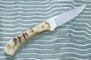 Sheep horn handle scales are secured to the full tang using brass pins. Sheep horn is an ideal choice for a hunting knife because it offers a comfortable, slip-resistant grip. The contoured handle feels great in the hand.