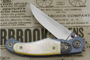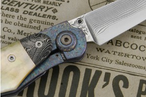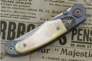 The frame and back strap are formed from hand textured and differentially anodized titanium (both inside and out). A damascus "bolster" is dovetailed to gold lip mother of pearl scales. Anodized titanium pivot. Smooth action. Exceptional work throughout