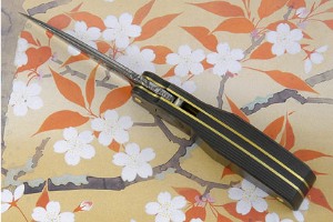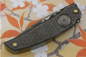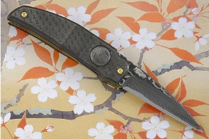 Description: Captain Koyama's work is always imaginative and inventive. The Japanese aesthetic permeates this visionary take on the traditional Wharncliffe style folder. The blade is formed from VG10 stainless steel, sandwiched between layers of stainless Damascus. The resulting blade will have a keen, long lasting edge. The spine has been fileworked for a secure thumb purchase. The scales are formed from aircraft grade carbon fiber and have been inlaid with domed damascus steel. A carbon fiber backbar sits between anodized titanium liners. Smooth action and excellent work throughout.