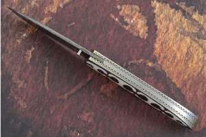 The drop point blade has silky-smooth action and is perfectly centered. The mosaic damascus used throughout the knife was forged by Ettoré Gianferarri, assuring that the patterns will be unique and different from those generally found on the American market. The dramatic pattern of the mosaic damascus blade is extremely complex and immediately grabs your attention. Because the blade is forged from carbon steels, we recommend using camellia oil to oil the blade and both the damascus and warthog tusk inlays.