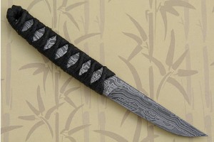Description: The Heavin Forge team, led by Mastersmiths Kevin and Heather Harvey, created this dramatic utility knife that combines tactical and Japanese elements. Heather forged the “W’s” pattern damascus that forms the blade and peeks through the black traditional Japanese cord wrap. This results in a captivating appearance and a superior grip. A black cowhide sheath tooled with a “footprint” pattern accompanies the knife. Exceptional workmanship, as expected.