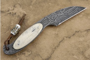 This knife features an exposed full tang and blade hand-forged from random pattern damascus. By using carbon steels, Heather assures a keen, long lasting edge. Stabilized giraffe bone overlays are set on the exposed damascus full tang. This small knife is very comfortable in the hand -- just big enough to get the job done, but small enough to be easy to carry. A leather lanyard is completed with a hand formed glass bead, also made by Heather. A brown tooled cowhide belt sheath accompanies this spectacular work by the Heavin Forge Team.