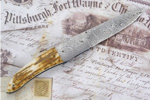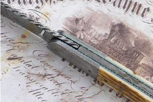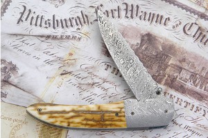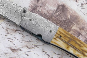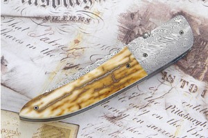 Description: South African knifemaker George Muller creates an exceptional knife at a remarkably low price. The bolsters and hollow ground blade are formed from stainless Damasteel. The pattern is immediately captivating and is nicely complimented by the precision grind lines. The spine has been fileworked for appearance and thumb purchase. Fossil mammoth ivory scales are dovetailed to the Damascus bolsters. The mammoth ivory has burnt cream and caramel tones. Titanium liners keep the knife light and very strong. They have been blue anodized and fileworked. An exceptional find!