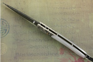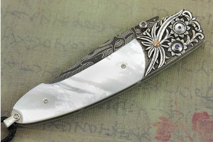 The blade is crafted Mike Norris Ribbon Lace damascus. The blade is brought to a razor edge and will have exceptional edge holding. A blue sapphire thumb stud nicely compliments the stark tones in the steel. The frame is crafted from sterling silver. The integral bolsters have been meticulously carved. Whitelip mother of pearl scales meet with the bolsters in an elegant arch.