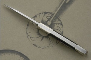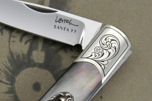 The mirror polished ATS-34 stainless steel blade is precision ground for a thin, high performance edge. It is easily opened using the thumb nick. Excellent action and well centered. Front and rear bolsters are perfectly fit to blacklip mother of pearl scales. A cast sterling silver lady in art deco style is set on the left scale. The sculpting was done by Leslie Tacetta. The bolsters have been engraved. The engraving was done by hand, one knife at a time by Rex Pedersen, a longtime member of the Engravers Guild of America.