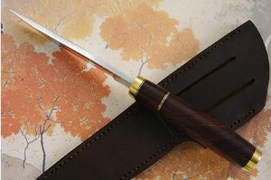 The warm toned cocobolo is nicely complimented by brass fittings. Alternating brass and black fiber spacers allow the handle to adjust to changes in temperature and humidity. The brass guard and butt cap create a perfect balance in the hand.