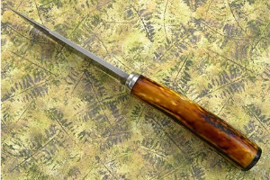 The handle is a downturned section of amber stag. The natural texture from the horn provides a comfortable grip. An end cap of buffalo horn nicely complements the stag. The handle is finished with a polished nickel silver guard.