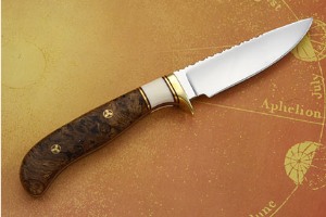 Description: The sturdy stainless steel blade is fileworked in the vine pattern. Both blade and tang are distal tapered for especially good balance. A cryogenic heat treat makes the blade have a particularly aggressive edge that will hold its sharpness. It was heat treated to Rc 60-61 (very hard), making a knife that will perform amazingly in the field. The stabilized oak burl scales have terrific, swirling grain patterns and are nicely offset by a warthog tusk spacer. Red fiber spacers allow the handle to adjust to temperature and humidity changes. The fit and finish, along with the fileworked spine, make this a knife that will feel at home in a collection or out in the field.