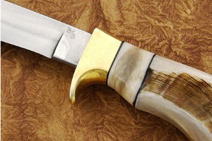 The handle combines sheep horn with a large brass guard. The guard protects your fingers from moving onto the blade's edge and brings the weight to the center of the knife. When wet, sheep horn does not become slippery, and it is amazingly durable. A spacer is created by taking two sheep horn end cuts and aligning them outward, producing a very pleasing effect. The knife is accompanied by a sturdy, 14 oz waxed leather pouch style sheath. An extremely comfortable handle. Excellent fit and finish throughout.