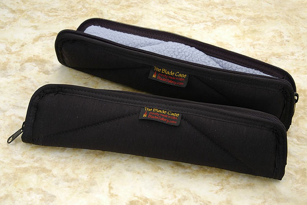 Description: Knife cases by The Blade Case are made by hand in Seattle, WA. Each case is constructed only with raw materials which have been made in the USA. Extra-heavy bonded nylon thread results in strength and longevity. All closures are made by YKK Zipper Co, the leader in closure technology. Zippers are self-repairing. Not all Cordura is alike. The Cordura used on these cases is 1000 denier DuPont Cordura. This strong fabric has excellent color and body. It repels water and does not absorb water vapor. The lining material is a synthetic shearling made by Polartec, providing both padding and insulation. No foam or other moisture-retaining materials are used. Different thicknesses of padding are used so that the case will perfectly hold your knife safely, securely, and with no or little movement.