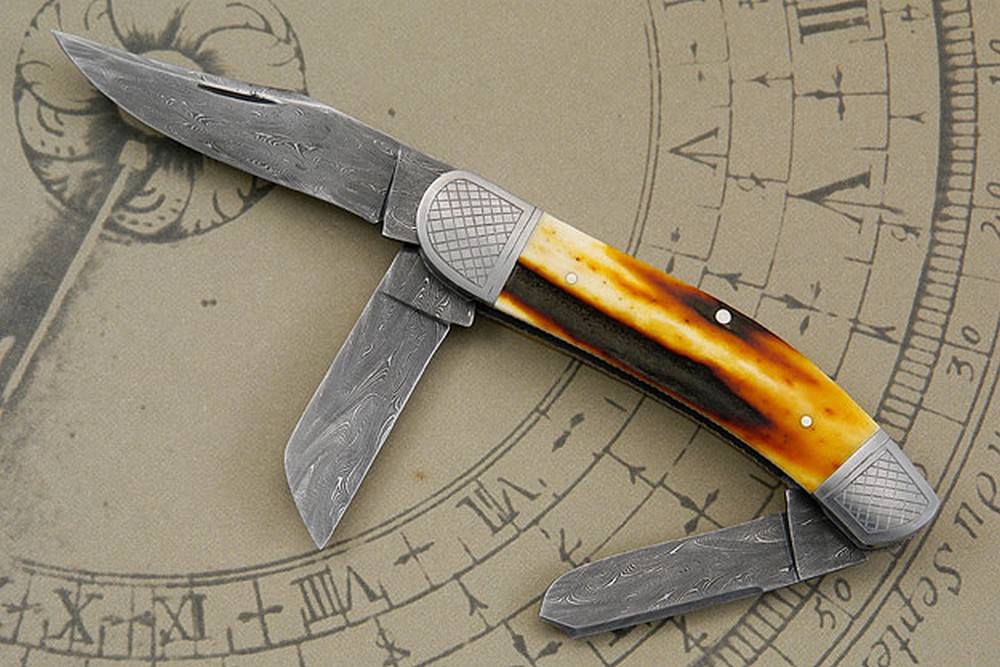 Description: This exceptional folder is Mastersmith Rick Dunkerley's first multi-blade knife. Each of the three blades is formed from Rick's multi-bar damascus, combining 1080 and 15N20 carbon steels. The multiple bars have been set in an opposing twist, resulting in a pattern that is immediately captivating. The large, clip point blade measured 2-1/2 inches. The clip point is commonly used as a multi-purpose blade and is preferred for its versatility. The sheepsfoot (wharncliffe) blade measures 1-3/4 inches. This blade shape results in more strength at the point of the blade making it a good tool for carving chews out of tobacco plugs. It is also used as a carpenter's blade. The razor blade measures 1-3/4 inches. This blade shape was developed for war veterans and allows the blade to be opened with one hand. The specially designed blade tip is uniquey tapered to hook onto the belt or other surface to open easily and requires only one hand to do so.