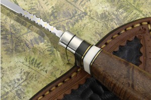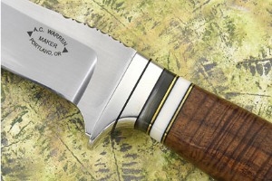 Description: Alan Warren creates a dramatic and exceptional Hunter/Skinner. The blade is formed from PM steel. This technique of making steel results in a smaller grain structure -- and therefore a keener, longer lasting cutting edge. A hand satin finish lends an heirloom quality. The spine is hand fileworked for thumb purchase.