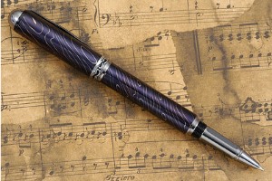 The barrel is formed from Fred's own damascus. The lazy nickel twist incorporates carbon steel with pure nickel for a very high contrast and deep blue/purple color. A two part high gloss top coat protects the steel from finger prints. The pen uses a standard size roller ball refill and comes with a high quality Hauser black roller ball. A ceramic ball nib assures smooth writing.