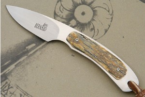 Description: This gent's hunter has a dramatic South African feel and look. Mammoth ivory scales are set on a full tang, assuring strength and durability. The ivory combines green, cream and caramel tones. The blade has been satin finished in the hollow grind and mirror polished on the flats. This accentuates the dramatic grind lines. This piece is small enough so as not even to notice that it is with you, yet large enough to do hard work. A great piece for a collection or to use in the field.