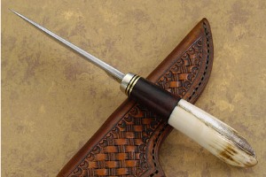 The handle is formed from a solid section of hippo tooth and is nicely shaped to comfortably fit in the hand. The cocobolo spacer provides contrast. Alternating brass and fiber spacers assist the handle to adjust to temperature and humidity changes. The handle feels so natural in the hand, you’ll have a hard time putting it down. A serious field knife for the avid hunter or collector.