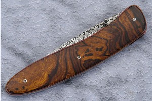Description: This is among my favorite knives by Andre van Heerden. The blade is formed from stainless Damasteel damascus, made in Sweden. The complex hollow grinds nicely show off the changing pattern. The handle scales are formed from desert ironwood. This exhibition grade wood has tremendous swirling grain patterns and a great mix of dark and light tones. The titanium liners have been anodized. The blade is well centered and has silky smooth action.