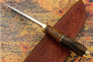 The warm toned spalted maple and dark walnut are nicely complimented by brass fittings. Alternating brass and black fiber spacers assist the handle to adjust to changes in temperature and humidity. The brass guard and butt cap create a perfect balance in the hand.