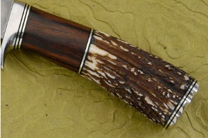 The handle combines warm toned desert ironwood with sambar stag. Stag of this quality has become increasingly rare. Alternating nickel silver and G10 spacers assist the handle to adjust to temperature and humidity changes. The nickel silver pommel has been carved to match the natural antler's texture. The handle feels so natural in the hand, you’ll have a hard time putting it down. A serious field knife for the avid hunter or collector.