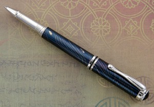 The barrel is formed from Delbert Ealy twist pattern damascus. Mild steel and pure nickel are combined into a brilliant twist pattern. The heat colored steel is very high contrast and deep blue color. A two part gloss top coat protects the steel from finger prints. Rhodium and black accents bands are used throughout the pen. The pen uses a spring loaded, standard size roller ball refill and comes with a high quality Schmidt (888F) black roller ball. A ceramic ball nib assures smooth writing.