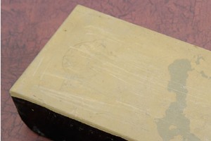 Despite the excellent performance of synthetic stones, many experienced sharpeners still prefer natural stones for sharpening their finest blades. Natural stones can bring out a blade’s full potential and allow the sharpening process itself to become a pleasant ritual. The finest stones from the Honyama quarries around mount Atago in the Kyoto area are becoming increasingly difficult to find. Natural Japanese stones are soaked in water prior to use but should not be stored in water like some synthetic stones. Following best practices, the sides of this stone have been lacquered. This aids the stone to keep structural strength while soaking. Natural stones have slight natural imperfections and may vary somewhat in size. You will find that different parts of the stone can work steel differently. Through experience with a stone, you find what might be considered a sweet spot.