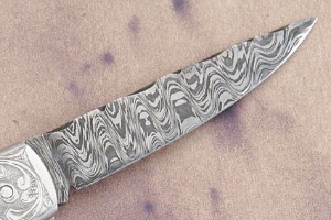 Description: This dramatic folding knife by Mel Fassio immediately grabs attention. The damascus blade features a dramatic, high contrast ladder pattern. The spine is hand fileworked in a vine pattern. 416 stainless steel bolsters are dovetailed to mammoth ivory scales for a good fit. Mel engraved the bolsters in floral scroll. Mammoth ivory scales are set on steel liners. The backbar, like the spine is hand fileworked. Nice work throughout!