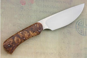 Description: This drop point hunter is an exceptional utility knife that will feel as at home in a collection as it will out in the field. The maple burl wood has a twisted, convoluted grain structure. The scales were stabilized, to ensure that the handle will hold up well to the rigorous demands of outdoor use. The blade has been satin finished in the hollow grind and textured on the flats. This accentuates the dramatic grind lines. 12C27 stainless steel assures a very keen, long lasting edge. A distal tapered full tang results in a strong knife with a perfect balance. Excellent fit and finish.