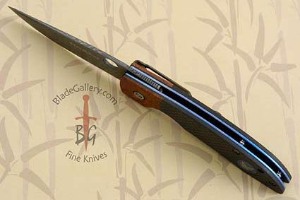 The modified drop-point blade is formed from stainless Hakapella Damasteel damascus. Sleek black carbon fiber scales have been set on titanium liners which are anodized to a clear blue. The Benchmade butterfly logo is etched into a matching anodized blue medallion set into the carbon fiber. Features DLC coated pocket clip and hardware and ambidextrous thumb hole. The patented AXIS mechanics ensure the knife feels as good as it looks, with performance to match. The 812-101 series is limited to 250 pieces. The knife is numbered on the blade and is accompanied by a custom presentation box.