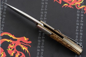 Stabilized spalted maple scales are set on gold anodized titanium liners. The burl has a swirling, dramatic grain pattern that becomes a focal point of the knife. Titanium construction keeps the knife light, yet extremely strong. The textured titanium pocket clip is mounted for tip up carry. Anodized and fileworked titanium backbar. Exceptional work throughout!