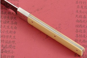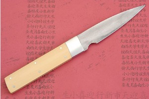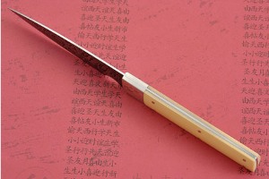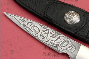 Description: John Leitch's desk knives will feel as at home in a collection as they will used in the kitchen or as an executive's desk knife. The A2 carbon steel blade was etched with a whale image by renowned Native American artist Isaac Tait. The antiqued surface nicely highlights the Native American whale image and was signed by Isaac. The A2 carbon steel blade was heat treated by Paul Bos to Rc 59 and will have exceptional edge holding. The fit between nickel silver bolsters and ivory micarta scales is excellent -- without a perceptible seam. Exceptional work throughout!