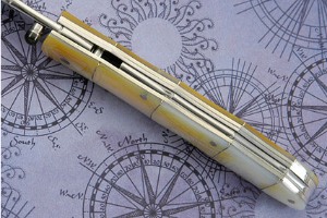 Handle: Sculpted exhibition grade gold lip mother of pearl set on stainless steel liners