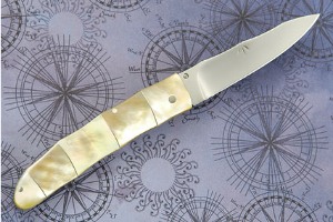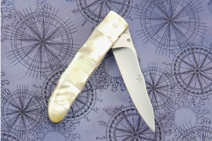 Goldlip mother of pearl has been sculpted into the shape of bamboo the entire length of the handle. Stainless spacers separate each of the "bamboo" sections. The mother of pearl has stunningly beautiful underlying texture and flash, its tones ranging from champagne to honey with flashes of a rainbow sheen. The stainless steel backbar as well as the spine have been fileworked to resemble bamboo, in keeping with the theme. The knife is completed with a thumb stud, inlaid with blacklip mother of pearl. The liners are jewel polished. Exceptional work throughout!