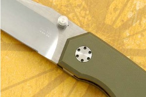 Handle scales are textured green G10. The angular, sculpted scales are set on anodized titanium liners, jewel polished on the interior. A partial backbar extends into a sharply delineated lanyard hole. Ambidextrous thumb studs and satin finished screws complete the piece.