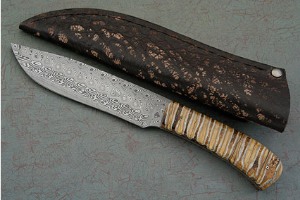 The drop point blade shows off the elegant damascus pattern to perfectly. Striated mammoth molar scales are set on a full tang for strength and durability. As at home in a collection as out in the field. The knife is accompanied by a hand stitched cape buffalo hide sheath. Excellent work throughout.