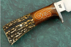 Description: Knives that have mixed the warmth of natural wood and stag have always been a favorite of mine and this knife does it to perfection. Fine silver inlay adds an heirloom quality to this exceptional Jay Hendrickson hunter.