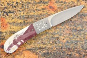 303 stainless steel bolsters are engraved in a floral pattern, providing a dramatic, secure thumb rest. Blue anodized titanium liners surround a stainless steel back spacer. The scales are dyed and stabilized warthog tusk -- cream toned with purple streaks moving through them. Exceptional work throughout.