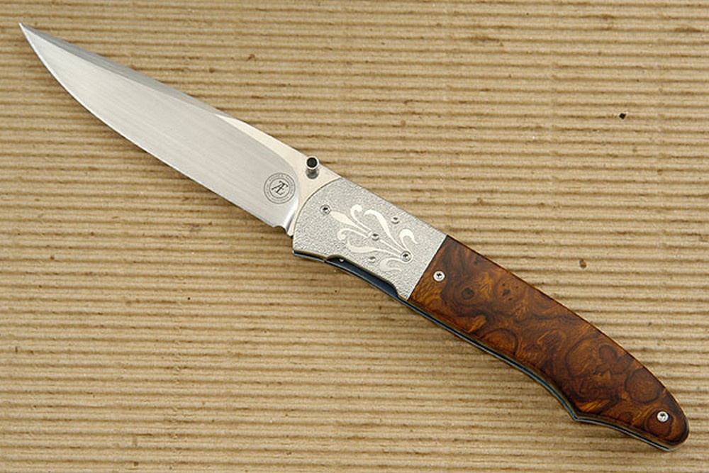 303 stainless steel bolsters are textured and engraved in a symmetrical stylized fleur-de-lis pattern, providing a secure thumb rest that is also very beautiful. The lines of the engraving match well with the grain of the ironwood scales. Fileworked, blue anodized titanium liners surround a stainless steel back spacer. Exceptional work throughout.