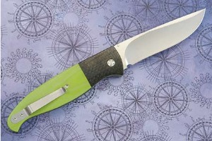 The scales are made from G10, in attention-grabbing toxic green. The texture of the G10 has been used to full advantage to create subtly patterned scales. Rather than using two separate pieces butted together, Andre created the G10 handle and inlaid carbon fiber into the bolster section. This results in very strong scales! These are set on anodized and mirror polished titanium liners. Exceptional fit throughout.