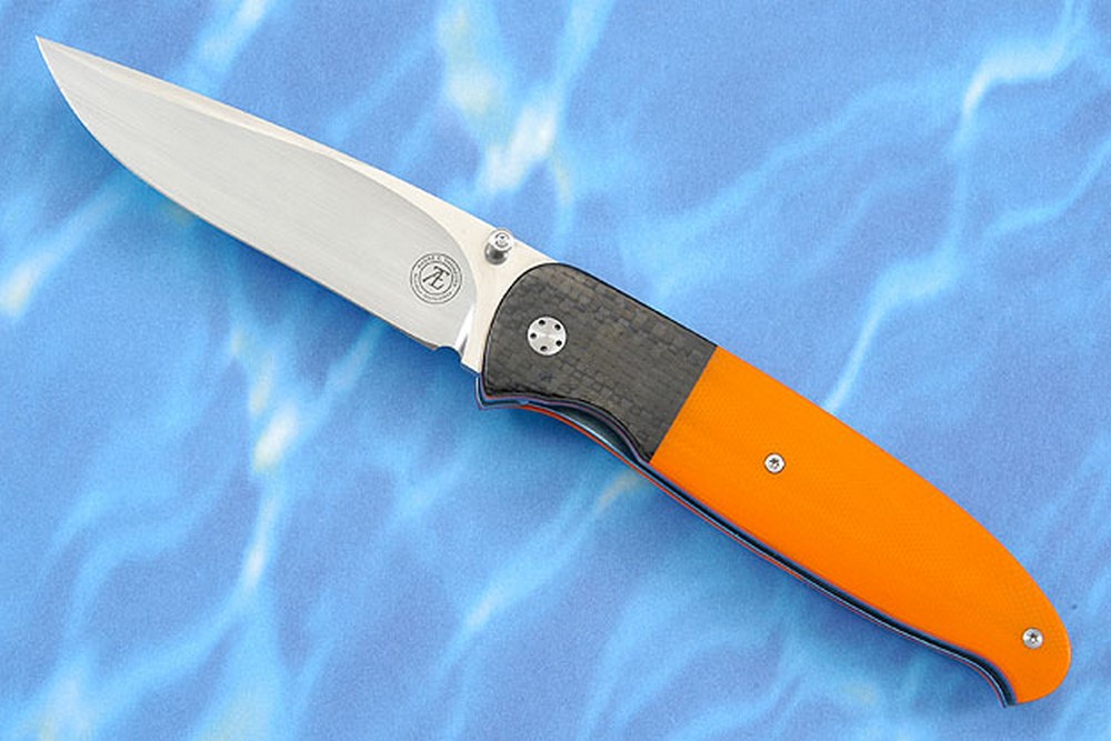 The scales combine orange G10 with carbon fiber in a finely fitted inlay. Rather than using two separate pieces end-butted together, Andre created the G10 handle and inlaid carbon fiber into the bolster section. This results in very strong scales! The satin finished clip is mounted for tip-up carry. The handle is completed with blue anodized titanium liners. Exceptional fit throughout.
