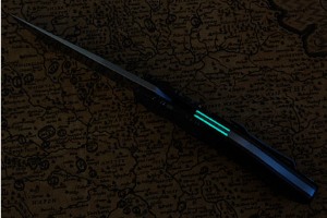 The backbar is inlaid with Moonglow II (luminescent polyester). This inlay glows in the dark, making the knife easy to find even under dark conditions. The knife is easy to keep close at hand using the pocket clip mounted for tip-up carry. Excellent fit and finish throughout.
