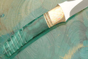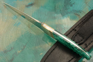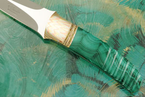 Mokume gane bolsters were forged from nickel, copper, and brass. The bolsters are dovetailed to malachite scales for a perfect fit. The malachite has been nicely carved for an elegant appearance and dramatic feel. The bolsters are fluted to match. The scales are set on a distal tapered full tang for perfect balance.