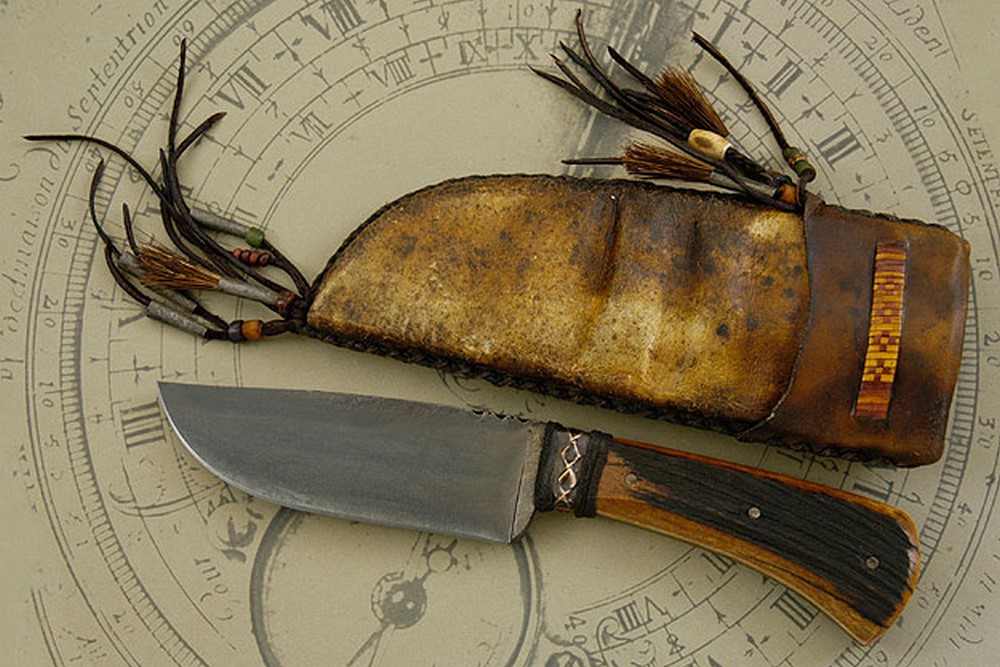 The knife is accompanied by a sheath by Karen Shook. The frontier style belt sheath is formed from vegetable tanned leather on the inside with a rawhide wrap. Deer hide thongs are decorated with glass beads, tin cones and horse hair. A porcupine quill band adds exceptional interest.