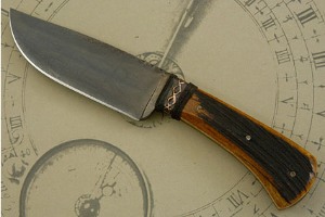 The handle is formed from burnt elk antler and is secured to the distal tapered full tang with two carbon steel pins. The handle is extremely comfortable in the hand. A patterned copper ferrule brings warmth to the handle.