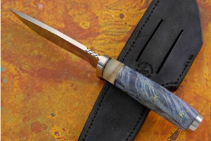 Handle: Dyed and stabilized blue box elder with a blond sheep horn spacer