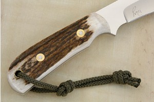 Description: Bob Lay's designs are well thought through and show an amazing degree of craftsmanship. This hunting knife is a pleasure to have by your side. Stag scales are set on a full tang for strength and durability. It is very rare to find a Bob Lay knife with a full tang. By mirror polishing the flats of the blade and satin finishing the grinds, Bob creates a knife with grind lines that are very dramatic. The blade has been heat treated to Rc 58.5 for optimal edge retention. Accompanied by certificate from the maker.